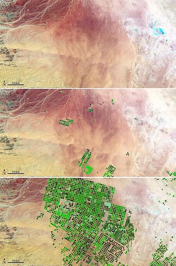 Rychlost šíření "chemického" zemědělství (jednotlivé satelitní snímky byly pořízeny v letech 1987, 1991 a v roce 2011). Saudská Arábie, která je bohatá na ropu, ale postrádá obnovitelné zdroje vod, využila příjmy z ropy a v uplynulých třech desetiletích investovala do rozvoje domácího zemědělství využívajícího neobnovitelné podzemní zdroje vod. Přímé a nepřímé dotace vedly k překotnému růstu zemědělské produkce. Obrovské otočné zavlažovací systémy byly postupně vybudovány v oblasti Wadi As-Sirhan, v pusté saudskoarabské poušti. Ovšem přiznané náklady na produkci jedné tuny pšenice dosáhly zhruba 500 US$, což je sice v přepočtu na koruny zhruba 10Kč za 1 kg, ale v daných podmínkách je to násobně více než je cena dovážené pšenice. V roce 2008 proto oznámila saudskoarabská vláda postupné ukončení produkce pšenice do roku 2016. Měřítko v levém dolním rohu má velikost 10 km. Přibližně kilometrový průměr kruhů je obdobný jako v případě Libye.