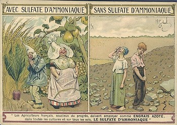 Nic nového pod sluncem. Minerální hnojiva se začala používat již v polovině 19. století. Na dobovém obrázku vidíme snahu malíře podpořit kyprými tvary hospodyně aplikaci chemické látky (síranu amonného) do půdy a zajistit tak rostlinám dusíkový luxus. Roli mužů v těchto příbězích si každý může převyprávět podle vlastní fantazie. Doprovodný text: "Se síranem amonným" (vlevo); " Bez síranu amonného" (vpravo). "Francouzští zemědělci, vědomi si pokroku, by měli používat síran amonný jako dusíkaté hnojivo na všechny plodiny a druhy půd" (v dolním rámečku).