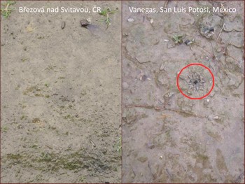 Půda nepřijímající další srážkovou vodu ani při nepatrném dešti. V levé části orná půda z okolí Březové nad Svitavou a v pravé části povrch bezodtoké polopouštní laguny ve střední části Mexika. V případě orné půdy je snížení infiltrační schopnosti půdy způsobeno dlouhodobou aplikací chemikálií a následným poškozením půdní struktury, v případě mexické půdy je to způsobeno vysokým podílem jílovitých a prachových naplavenin a navátin z větrných erozí.Zablácená hvězdice v kroužku je do země zatažený kaktus (Ariocarpus kotschoubeanus). Přestože jsou obě půdy od sebe vzdáleny více než deset tisíc kilometrů, mají kromě snížené míry zasakování srážkové vody také společné osidlování povrchu půdy řasami (zelená barva) a sinicemi (tmavá barva) - příroda se nevzdává.