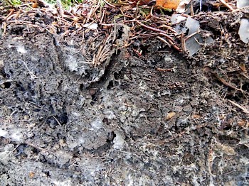 Boční pohled do půdy jehličnatého lesa v okolí Březové nad Svitavou, nedaleko od orné půdy z předchozího snímku. Dobře je viditelná síť chodeb a chodbiček zpevněná sítěmi houbových vláken. Les umí "nakrmit" organickými látkami svou přátelskou půdní havěť. Není divu, že se v lese mění povrchový odtok na podpovrchový. V takových půdách je množství vody stékající po povrchu půdy při přívalových srážkách nesrovnatelně nižší, pokud je vůbec nějaké.