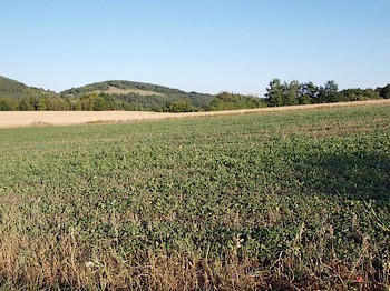 Stále vzácnější, oku a duši lahodící pohled na jeteloviny. Nejsou sice úplně v kondici, ale na podmínky loňského horkého léta jsou stále ještě zelené na rozdíl od travin z remízku vykukujících ze spodního okraje snímku. Naši předkové a současní osvícení hospodáři intuitivně tušili a tuší, že jeteloviny a jiné bobovité rostliny jsou jedinou požehnanou cestou dusíku do půdy. Na rozdíl od aplikace syntetického dusíku v minerálním hnojivu se přímo do půdy dostává organická hmota, která povzbuzuje půdní život. Neobstojí výmluvy, že tuto plodinu nelze zkrmit, že chybí živočišná "výroba", atd. Jde jen a jen o posun v našich hlavách, o to, vzdát se výdělku z této plodiny, třeba jen zapravit rostlinnou hmotu jetelovin do půdy a investovat tak do oživení půdy. Hospodář pak může usínat s klidným svědomím, hospodaří za své, protože každý sluneční paprsek je rostlinami využit a z půdy nekouká "hnědá". "Často jsem slyšel od starých lidí, že hospodáři jetelinu dávali na pole hned po obilí. To co stačilo do podzimu vyrůst, "nebylo sice úplně v kondici", ale pěkně se tomu říkalo: "jetelíček strnišťák". Ale na to se teď v době řepkové už nehraje..." dodává Petr Koukal.